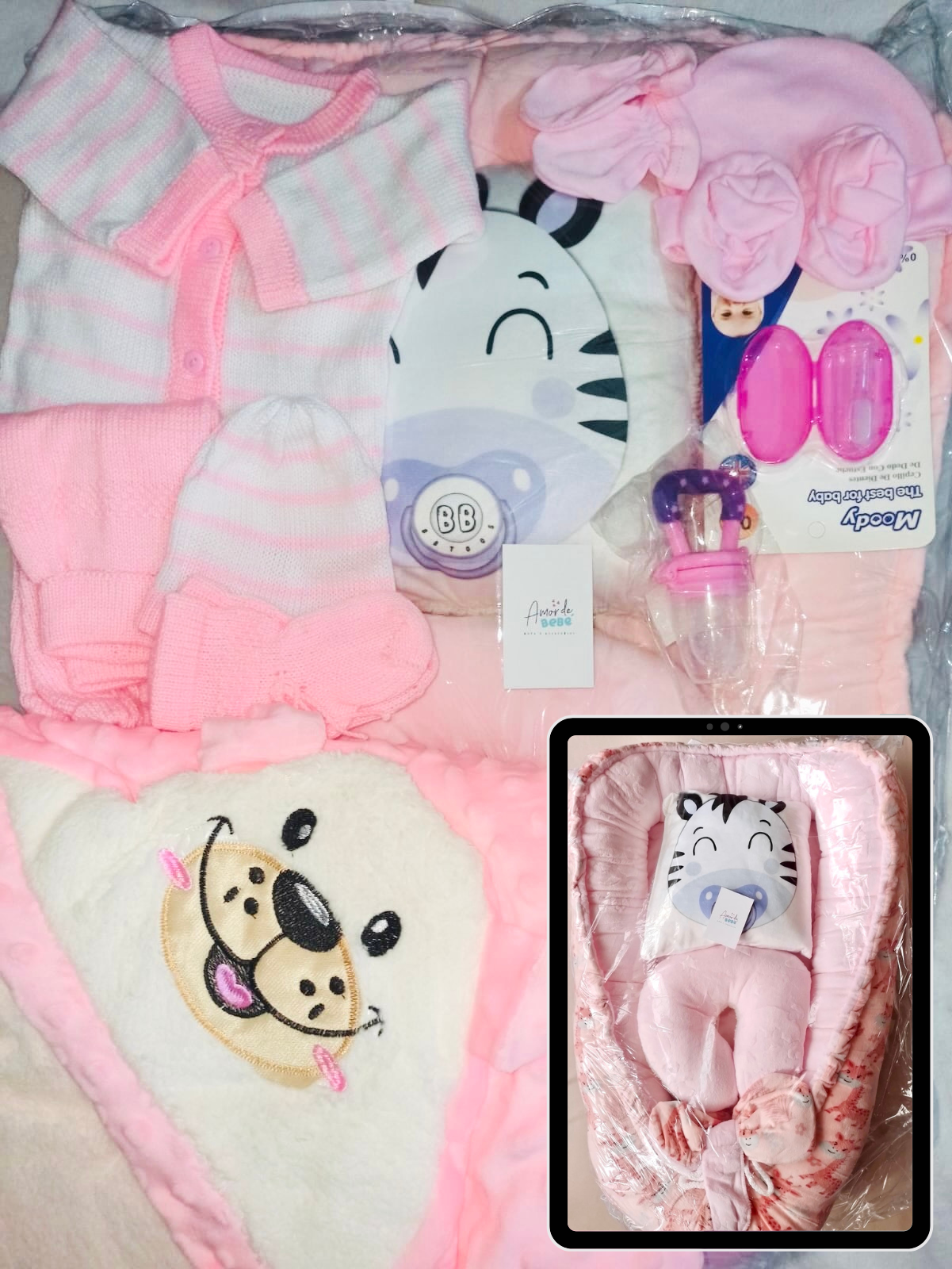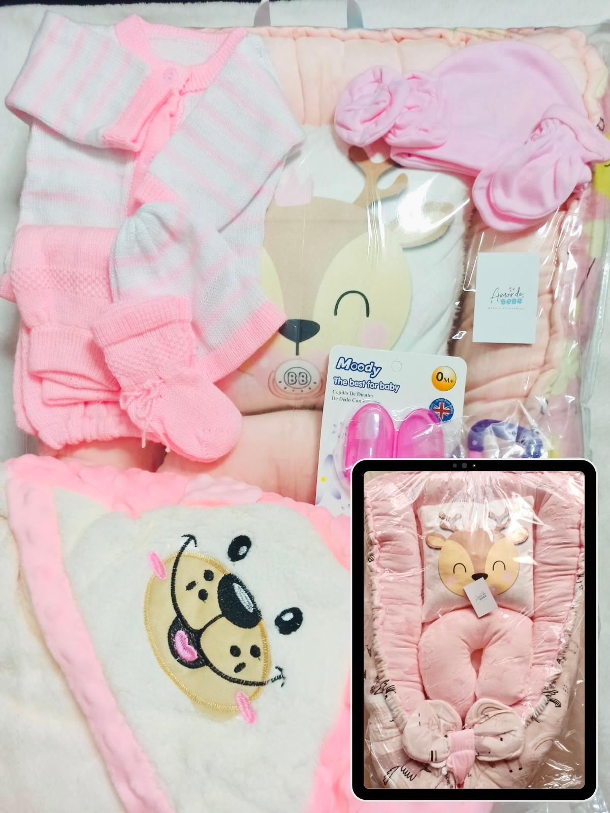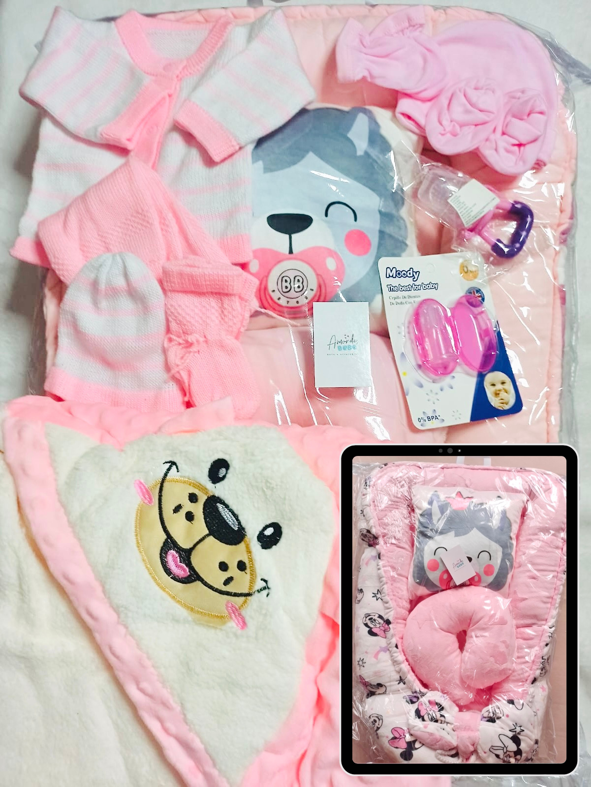 Este combo para Niñas consta de un práctico nido para bebé, dos almohadas para su comodidad y estabilización, una suave cobija burbujas y un conjunto de ropa tejida, set en franela para mantenerlo abrigado. También incluye un chupo para darle frutas y verduras y un cepillo para su higiene bucal. ¡Todo lo que necesita para cuidar a su pequeño en un solo paquete!