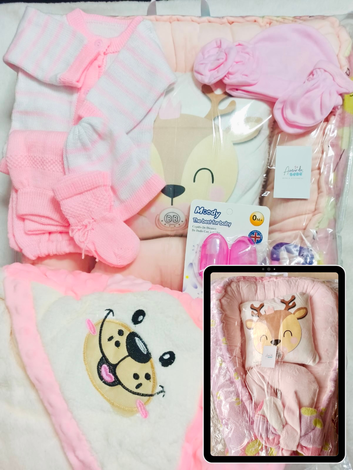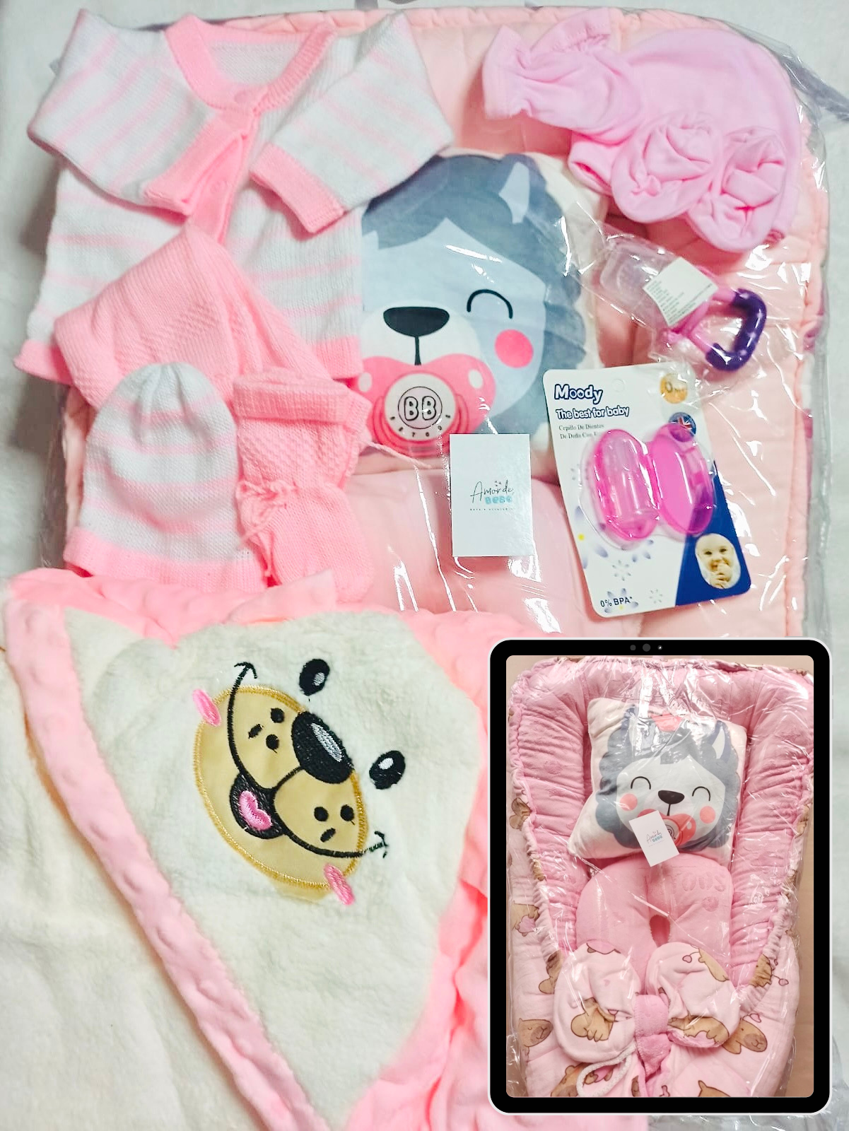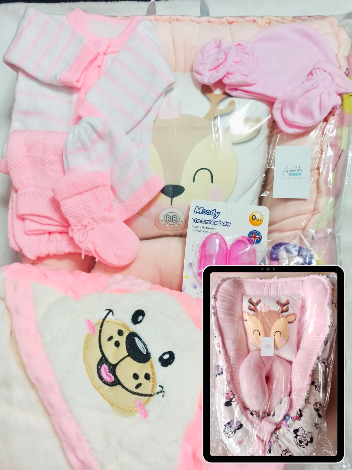 Este combo para Niñas consta de un práctico nido para bebé, dos almohadas para su comodidad y estabilización, una suave cobija burbujas y un conjunto de ropa tejida, set en franela para mantenerlo abrigado. También incluye un chupo para darle frutas y verduras y un cepillo para su higiene bucal. ¡Todo lo que necesita para cuidar a su pequeño en un solo paquete!
